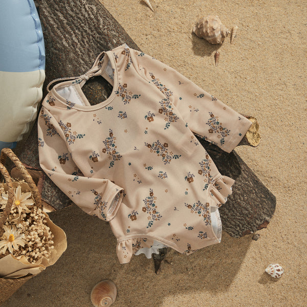 Ropa de baño para bebé con mangas, con lindo detalle en la espalda.